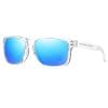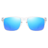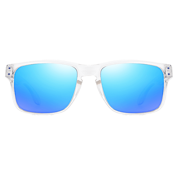 Las Interlagos combinan montura transparente con lentes marrones polarizadas y efecto espejado azul, logrando un estilo dinámico y masculino. Detalles en azul en los talones aportan un guiño racing que no pasa desapercibido.
