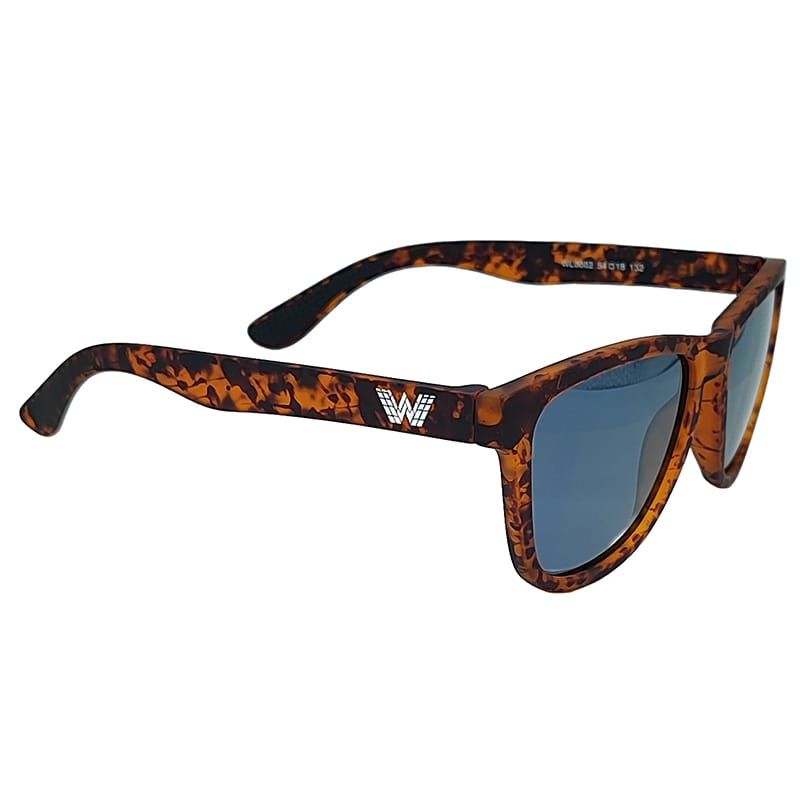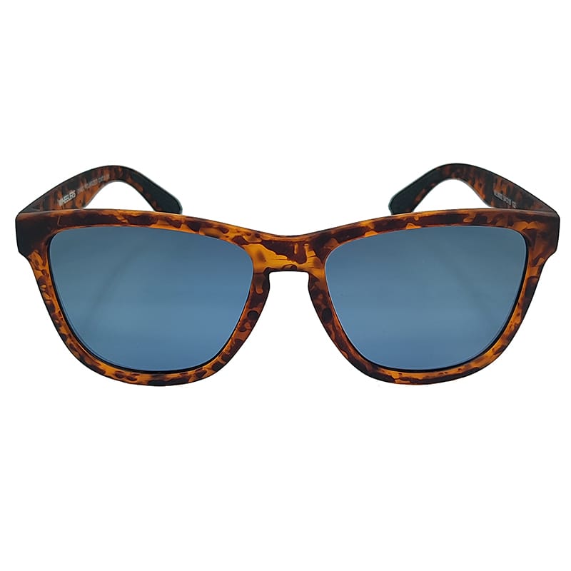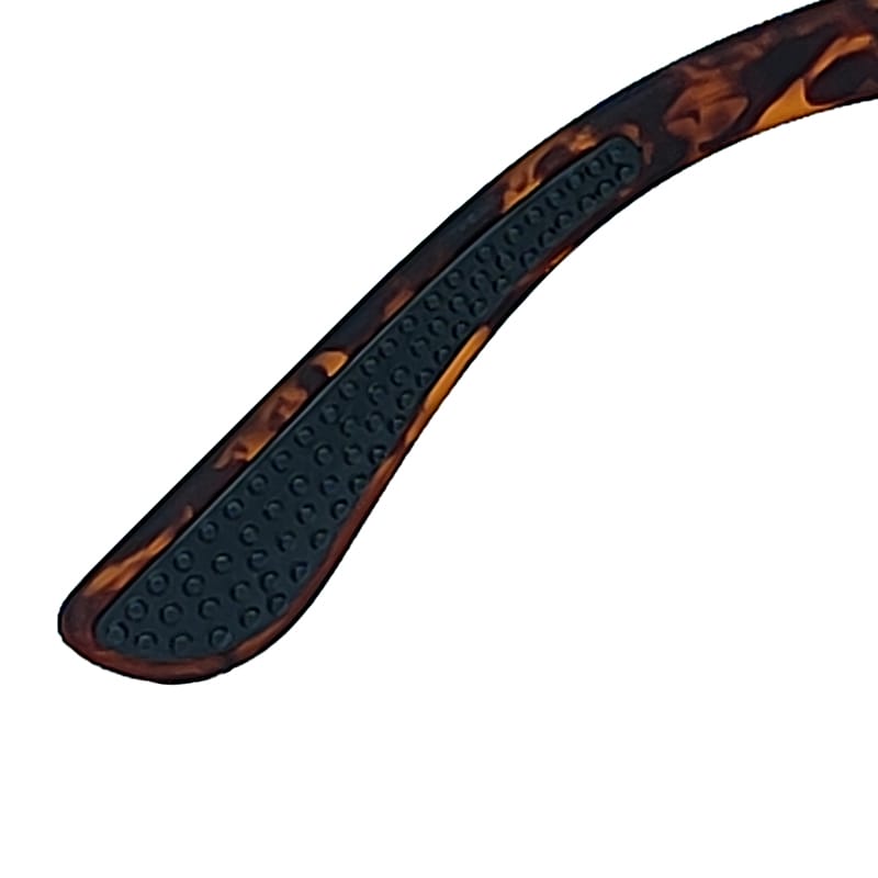 Montura marrón Habana con lentes grises polarizadas. Inserciones de goma negra en las varillas aseguran un agarre firme y un estilo atemporal con carácter deportivo.